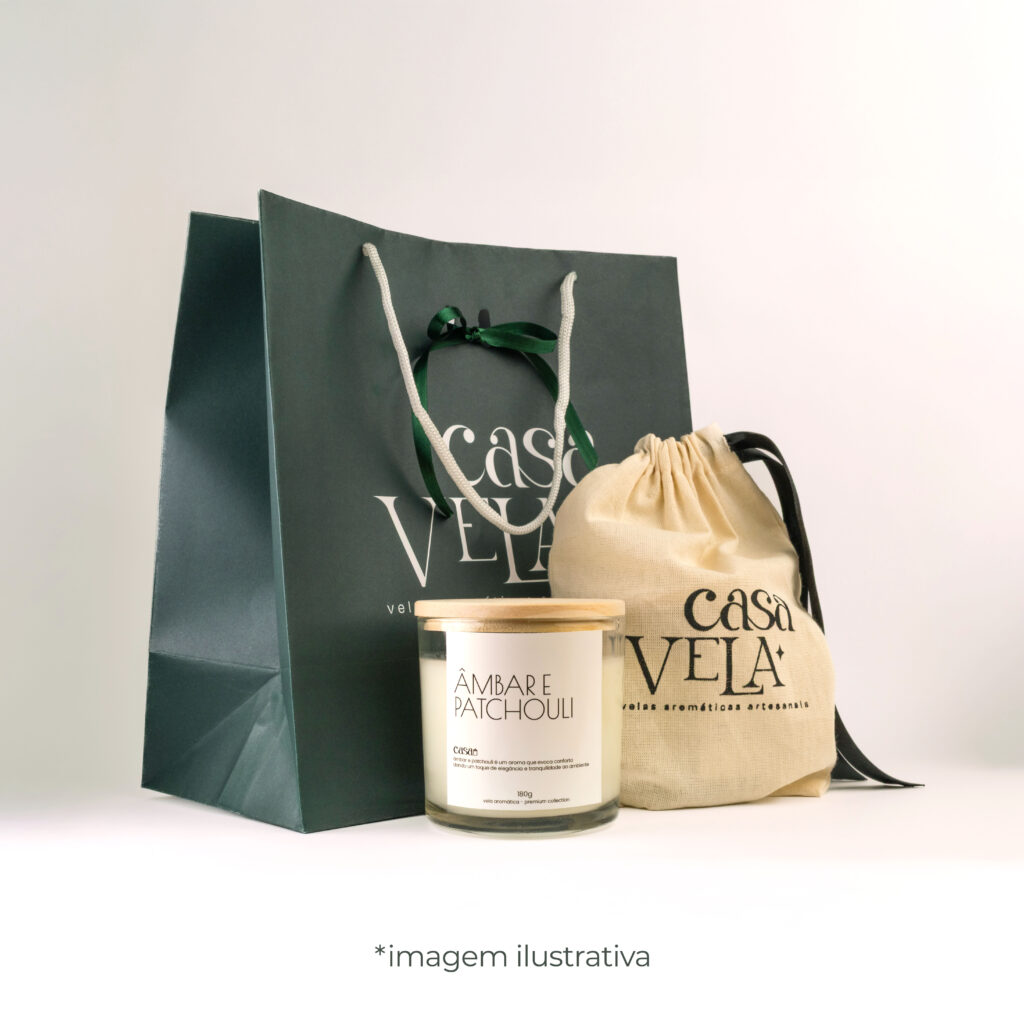 Mas o diferencial não para por aí. Cada vela vem acompanhada de um saco de algodão cru personalizado com a logo da CasaVela, um toque artesanal que reforça o cuidado e o valor por trás de cada produto.